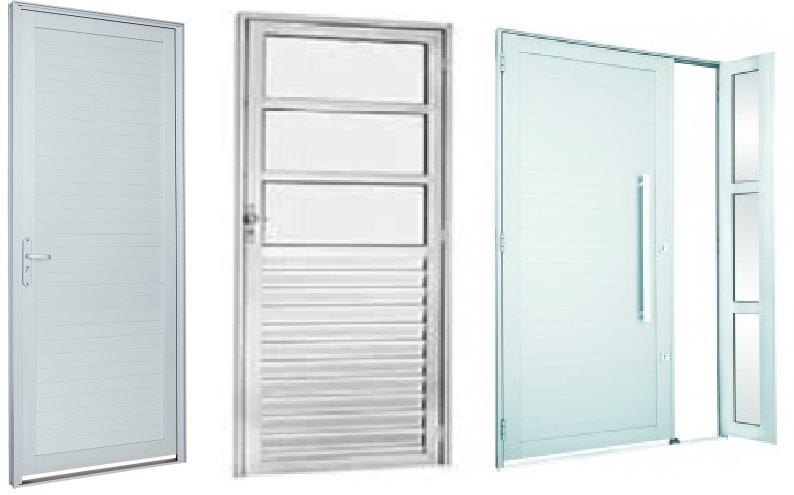 Portas de giro ou pivotantes.Fabricamos em qualquer dimensão, com vidros ou fechamento em lambri. Abertura para esquerda ou direita, com fechaduras simples, puxadores e aplicações especiais. Trabalhamos com alumínio branco, natural, brilhante. Também nas opções em preto e bronze.